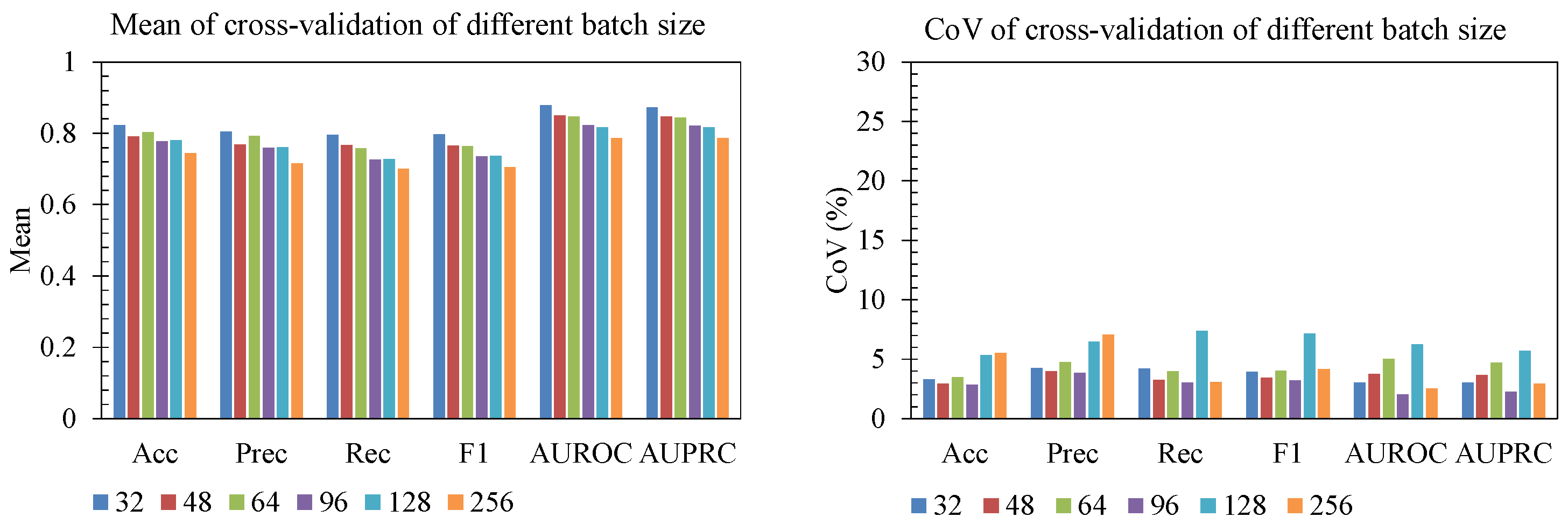 Figure 6), smaller batches (32–64) produced the highest mean accuracy, precision, recall, F1, AUROC, and AUPRC. As batch size increased beyond 96, performance declined and became less reliable, with batch 256 showing both lower mean scores and elevated CoV for several metrics. This indicates that overly large batches hurt generalization. For learning rate (