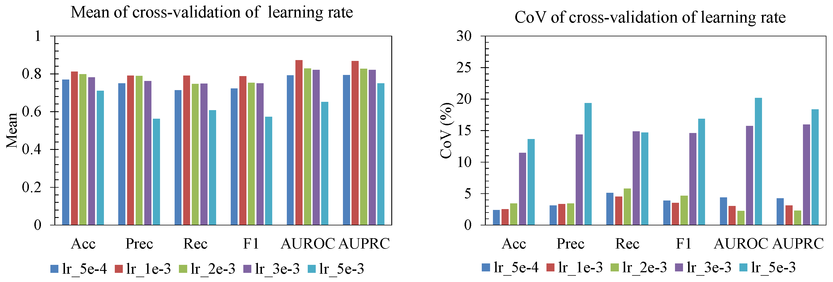 −3 achieved strong mean performance with a relatively low CoV across folds, whereas too-small learning rates (5 × 10