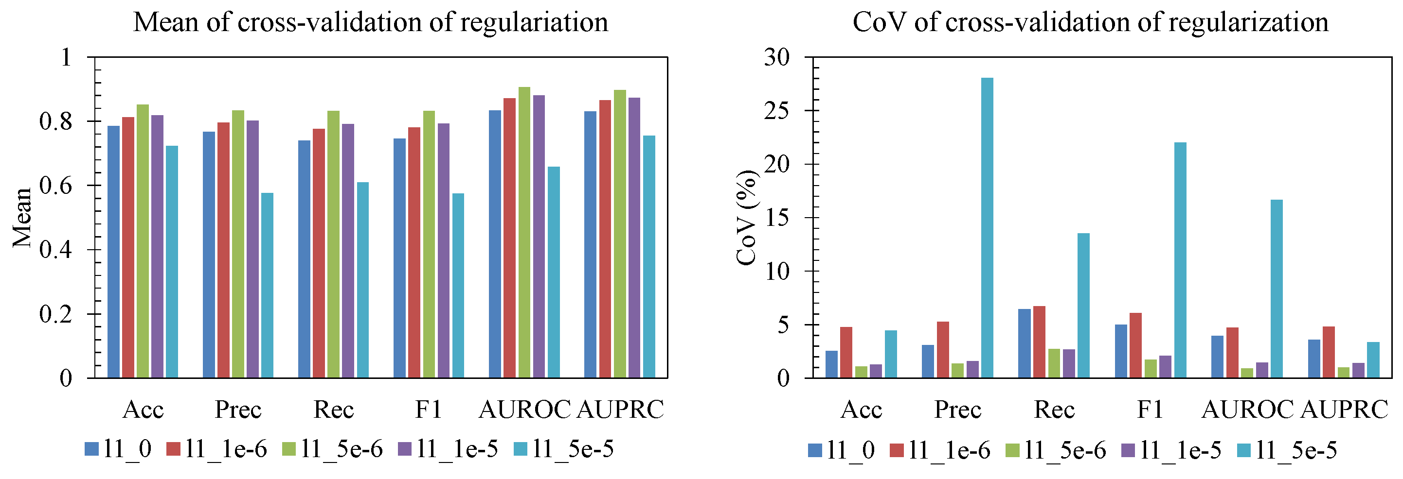 −6) led to higher mean F1, AUROC, and AUPRC with low CoV (<5%), while stronger L1 (≥10