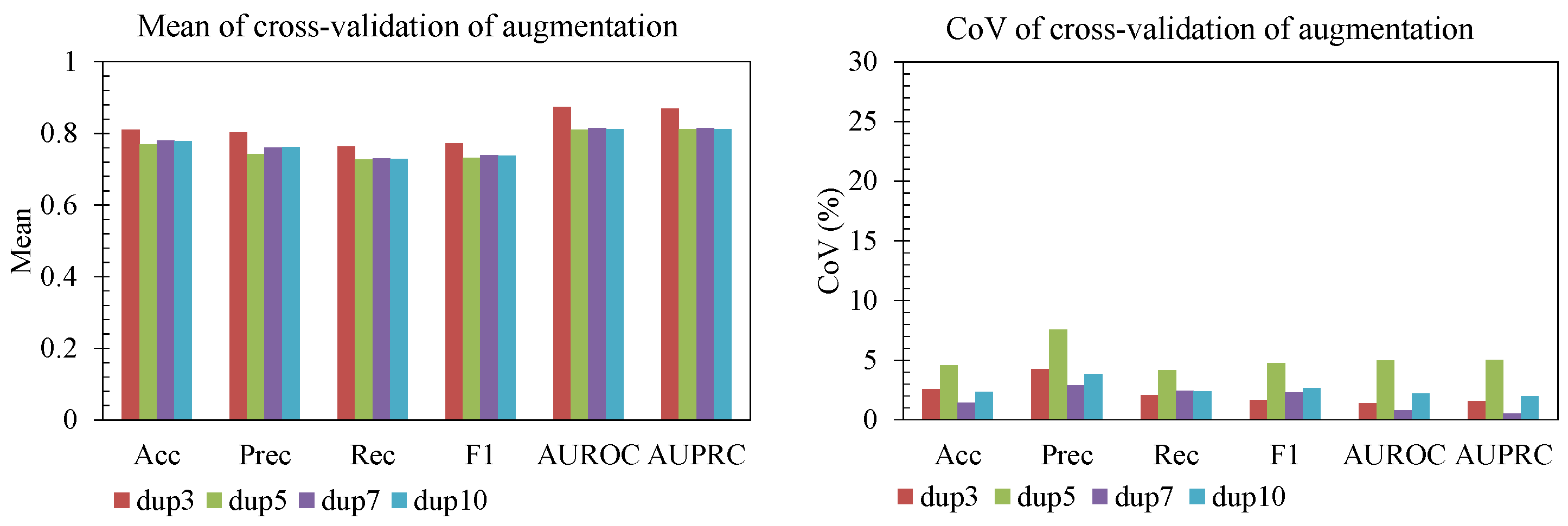Figure 10). For augmentation, a duplication factor of 3 (dup3) achieved slightly higher accuracy, precision, recall, and F1 than heavier duplication (dup5–dup10). At the same time, the coefficient of variation (CoV) remained low (generally <5%), indicating that these gains were consistent and not driven by a single fold. Increasing duplication beyond 3 did not yield additional improvement and in some cases increased variability (e.g., precision and recall for dup7), suggesting diminishing returns once synthetic balance saturates. For weight decay, moderate values (3 × 10