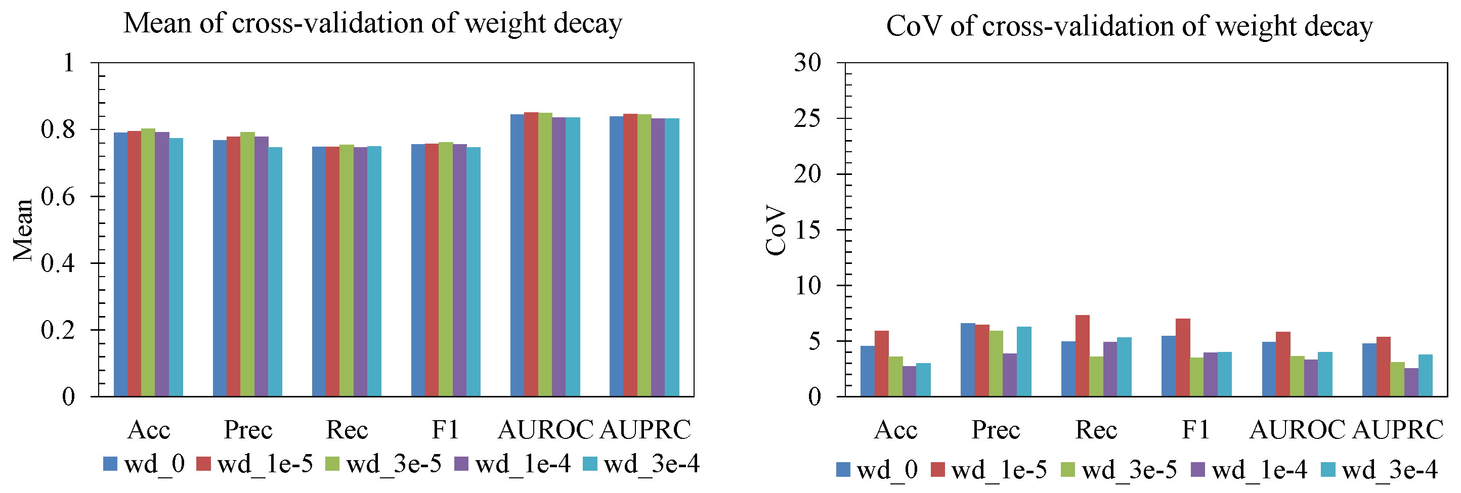 −4) produced the best trade-off: a high AUROC/AUPRC and strong F1, with a relatively low CoV across folds. With no decay, performance and stability both degraded slightly, while overly strong decay (3 × 10