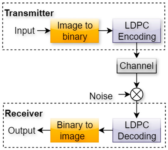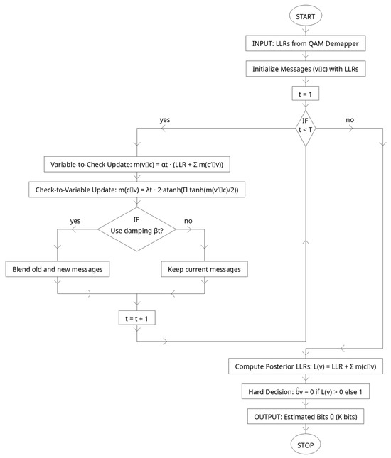 Low-Density Parity-Check (LDPC) codes are employed in the proposed system to provide structured redundancy, ensuring resilience against noise and channel impairments. LDPC codes are defined by a sparse parity-check matrix , where is the codeword length and is the number of parity constraints for a message of length . A valid LDPC codeword must satisfy the linear constraint