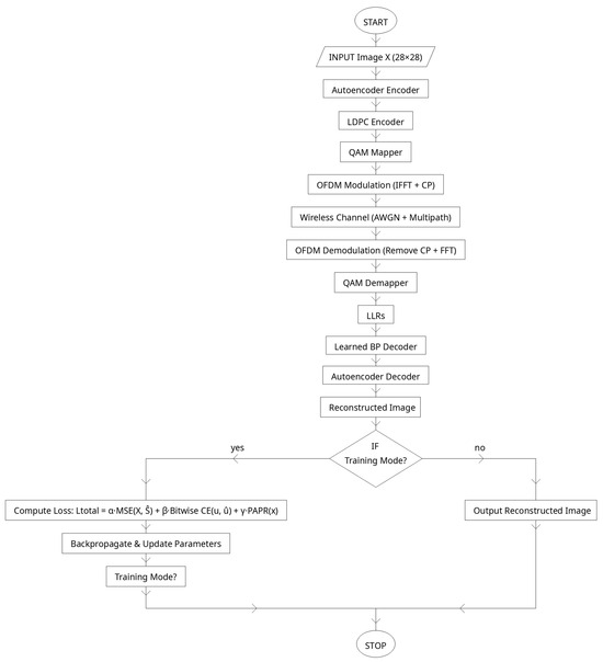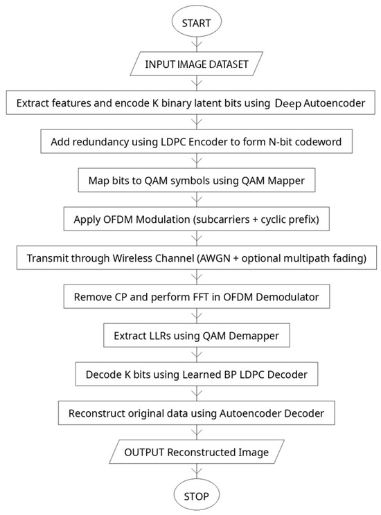 The proposed system, presents a complete end-to-end workflow of the Deep Autoencoder (DAE)–LDPC–OFDM transceiver integrated with a learned belief propagation (BP) decoder. This architecture is designed to jointly optimize data compression, channel encoding, modulation, and decoding in a unified learning framework. Unlike conventional communication systems that treat each of these components as separate blocks, the proposed transceiver leverages deep learning to connect them through differentiable layers. This design enables the network to learn feature hierarchies, adapt redundancy levels, and dynamically adjust to varying channel conditions. The system achieves robust, power-efficient transmission with low error rates and high reconstruction fidelity, representing a step toward fully intelligent communication architectures for 5G and beyond (see Figure 3).