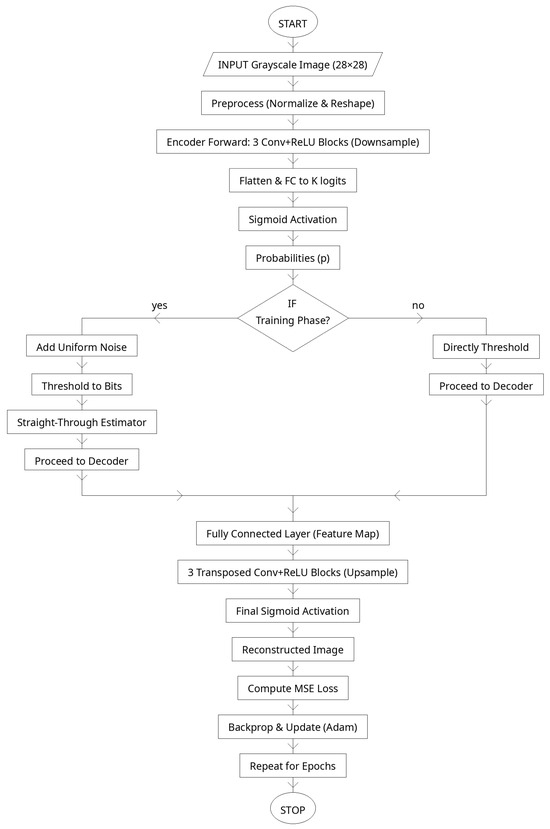 The kernel size of 3 × 3 is a standard choice in convolutional architectures as it efficiently captures local spatial correlations and edge patterns without excessive computational cost. The stride of 2 was applied to perform both feature extraction and spatial downsampling, reducing input dimensionality while retaining salient structures, which is ideal for grayscale image inputs of size 28 × 28. The progressive increase in feature maps from 16 → 32 → 64 enables hierarchical feature learning, where lower layers capture fine textures and higher layers encode abstract, noise-tolerant representations suitable for binary latent mapping.