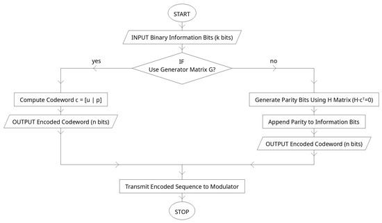 The encoding process relies on a corresponding generator matrix , constructed from such that every encoded codeword satisfies the parity-check condition. The generator matrix is typically expressed in systematic form: