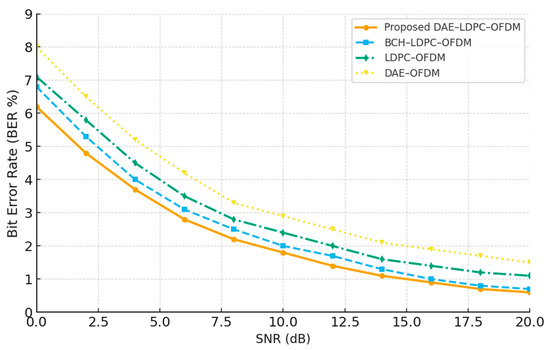 Figure 11 illustrates the relationship between throughput and signal-to-noise ratio (SNR) for the proposed DAE–LDPC–OFDM and baseline systems. The proposed model consistently achieves higher throughput across all SNR levels compared to other dual-coded schemes, owing to its latent-space compression and adaptive redundancy balancing. While LDPC–OFDM and BCH–LDPC–OFDM exhibit lower throughput due to additional parity overhead, the DAE’s efficient representation preserves much of the data rate despite the added coding layer. At high SNR levels, the performance gap between DAE–LDPC–OFDM and traditional systems widens, confirming that the proposed design maintains both reliability and spectral efficiency even as channel conditions improve.