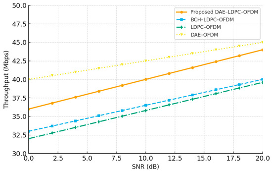 Throughput vs. SNR for DAE–LDPC–OFDM, DAE–OFDM, LDPC–OFDM, and BCH–LDPC–OFDM.