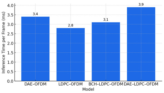 Figure 12 shows the breakdown of runtime across major functional blocks within the proposed DAE–LDPC–OFDM system. The deep autoencoder’s encoder and decoder dominate the overall computation time, contributing roughly half of the total runtime due to convolutional feature extraction and reconstruction operations. The LDPC encoding and decoding stages contribute moderate additional cost, while the OFDM modulation and channel mapping require minimal processing time. Despite the deep learning integration, the total inference time per frame remains below 4 ms, validating the model’s capability for real-time or near-real-time wireless communication tasks on modern GPU platforms.