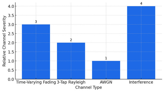 Figure 13 illustrates the range of channel models used to test the robustness of the proposed DAE–LDPC–OFDM transceiver. The severity of the channel conditions increases from left to right, starting with the ideal AWGN channel, followed by static multipath (3-tap Rayleigh), dynamic fading with Doppler shifts (Time-Varying), and finally, the harsh Interference channel that combines multipath and co-channel interference. This visual summary emphasizes the comprehensive evaluation of the system under both ideal and degraded wireless environments, validating its adaptability and reliability across diverse propagation conditions.