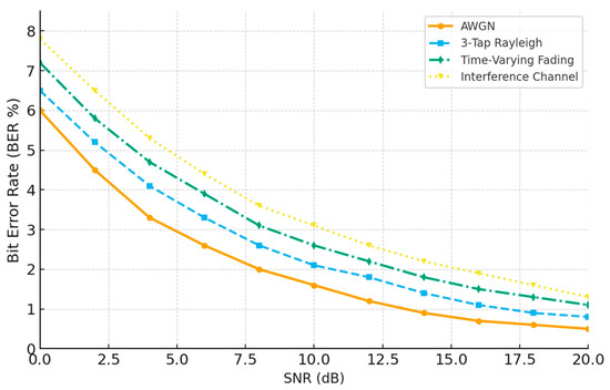 Evaluation under extended channel conditions—ranging from AWGN and static Rayleigh to time-varying fading and interference-dominant channels—further validates the adaptability of the proposed framework. The system maintains low BER even under non-stationary and interference-heavy environments, demonstrating strong robustness to Doppler effects and channel instability. This highlights the model’s capacity to generalize across dynamic propagation conditions that are commonly encountered in mobile and vehicular communication systems.