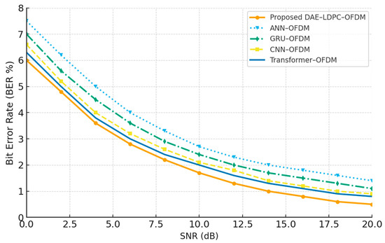 To further validate the superiority and modern relevance of the proposed DAE–LDPC–OFDM transceiver, a comparative analysis was conducted against recent deep-learning-based communication architectures, including ANN–OFDM, GRU–OFDM, CNN–OFDM, and Transformer–OFDM. These models represent the main families of neural transceiver architectures—feedforward (ANN) [25], recurrent (GRU) [26], convolutional (CNN) [27], and attention-based (Transformer). Each baseline was trained and evaluated under identical conditions and SNR ranges for fairness. While these methods can capture certain structural or temporal features, they typically lack the multi-level representation compression and adaptive redundancy of the DAE–LDPC design. The results confirm that the proposed system achieves the lowest BER and highest robustness, while maintaining a reasonable computational footprint, achieving an optimal balance between complexity and communication reliability.