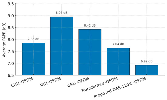 To further evaluate transmission efficiency, this subsection compares the Peak-to-Average Power Ratio (PAPR) performance of the proposed DAE–LDPC–OFDM system with modern neural-based OFDM architectures, including ANN–OFDM, GRU–OFDM, CNN–OFDM, and Transformer–OFDM. PAPR is a critical metric for OFDM systems, as high power peaks can cause nonlinear distortion and reduce power amplifier efficiency. By integrating deep feature compression through the DAE and redundancy-aware signal mapping via LDPC, the proposed framework achieves lower PAPR levels without requiring explicit clipping or companding techniques. This confirms that the DAE–LDPC–OFDM system not only enhances BER performance but also improves energy efficiency and signal linearity during transmission.