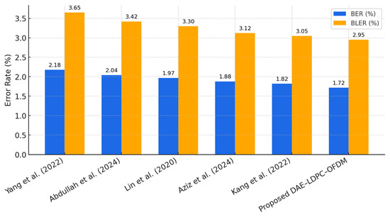 Figure 17 presents a comparative evaluation of the Bit Error Rate (BER) and Block Error Rate (BLER) performance among recent deep learning–based OFDM architectures. The proposed DAE–LDPC–OFDM achieves the lowest error rates, outperforming prior models that rely solely on convolutional or attention-based representations. The consistent reduction in both BER and BLER confirms that the joint use of deep latent-space encoding and LDPC redundancy provides superior error resilience under noisy channel conditions. While other systems such as Kang et al. [27] and Aziz et al. [26] deliver competitive results, they require higher computational complexity or specialized MIMO channel assumptions. The DAE–LDPC–OFDM therefore stands out as a more efficient and adaptive approach that maintains robustness, reliability, and generalizability across standard OFDM communication scenarios.