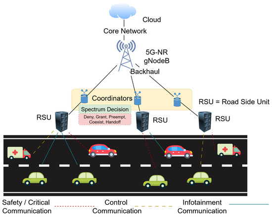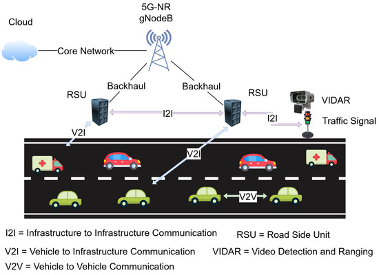 Three paradigms for vehicular communication are depicted in Figure 1. Vehicle-to-Vehicle (V2V) links allow peer-to-peer interactions among proximal vehicles, supporting time-critical messages such as collision avoidance and cooperative awareness. Decentralized groups provide very low latency but are constrained by interference in the spectrum and the highly dynamic vehicular graph. Vehicle-to-Infrastructure (V2I) communication extends connectivity to roadside units (RSUs) and base stations, enabling centralized resource management, traffic signal control, and access to cloud-based services. V2I is particularly pertinent, as it is the interface wherein multiple vehicles contend for spectrum under varying traffic loads. Infrastructure-to-Infrastructure (I2I) communication contributes to network robustness by interconnecting RSUs and base stations through backhaul links, allowing inter-cell coordination, spectrum sharing, and handoff assistance. While the three modes all contribute to the V-IoT ecosystem, the most stringent and impactful spectrum access decisions occur in the V2I domain. To this end, this research focuses on RL-based spectrum management at the RSU level for efficient, reliable, and fair channel assignment across safety-critical, control, and infotainment traffic classes in dense vehicular deployments.