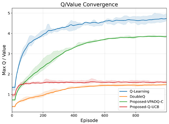 The convergence characteristics of RL algorithms reveal their stability and sample efficiency. Figure 3 shows the evolution of the maximum Q-values across training episodes. Q-Learning exhibited the fastest initial Q-value growth, saturating near 5.0 but with large fluctuations that indicate overestimation bias. DoubleQ achieved smoother growth and stabilized around 3.8, confirming reduced variance. Both VPADQ-C and Q-UCB converged with smaller absolute Q-values (≈1.5–2.0) but notably narrower confidence bands, evidencing stable and unbiased value estimates.