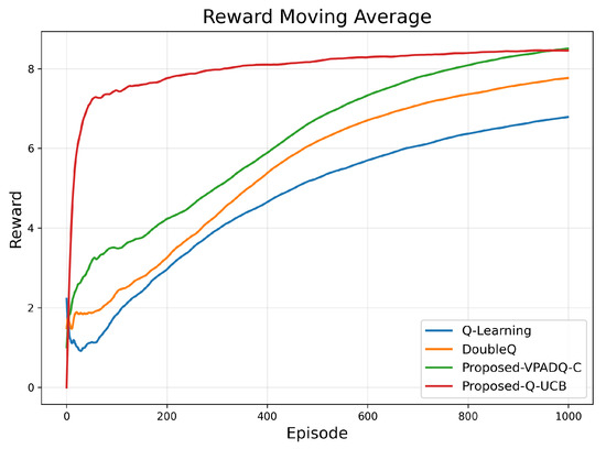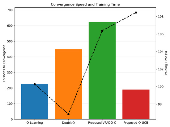 Regarding training efficiency (Figure 18), Q-Learning converged after around 230 episodes, with a training time of around 100 s. DoubleQ required about 450 episodes but learned slightly faster, in about 97 s, due to its less complex update rule. VPADQ-C converged more slowly after about 620 episodes, with a total training time of about 106 s, as the CMDP dual variables required more iterations to stabilize. On the other hand, Q-UCB converged the fastest, with stability achieved in approximately 190 episodes, although the overall training time was slightly higher (approximately 109 s) due to the extra UCB-based confidence calculations. These results confirm that the designed Q-UCB method achieves the best trade-off between learning speed and training efficiency.