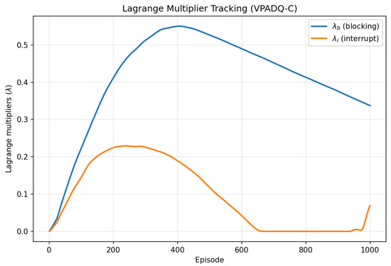 where and denote the observed blocking and interruption rates, and are their respective target bounds, and are Lagrange multipliers. VPADQ-C employs two Q-tables, and , which are alternately updated. For each visited state–action pair , the update rule is shown in Equation (14):