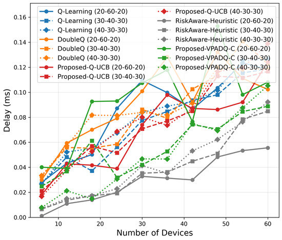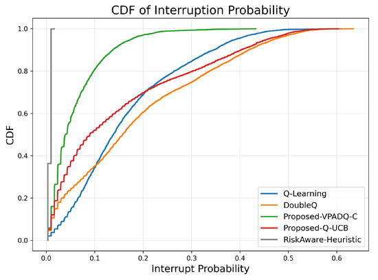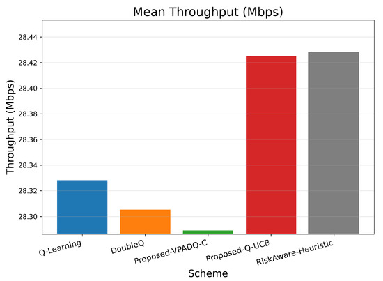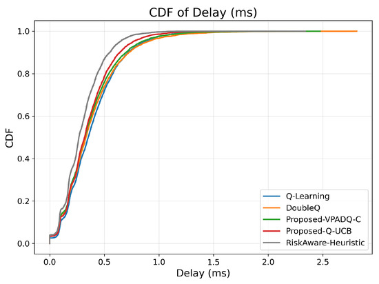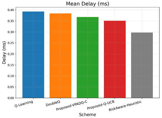 As seen in Figure 11, Q-Learning achieved the highest mean delay of about 0.391 ms, followed by DoubleQ, which was slightly lower at 0.382 ms. Our proposed VPADQ-C achieved a lower average value of 0.370 ms, followed by Q-UCB at 0.351 ms. The Risk-Aware Heuristic achieved the lowest average latency of 0.297 ms, a reduction of nearly 24% compared to the Q-Learning baseline.
