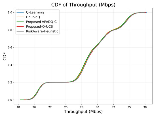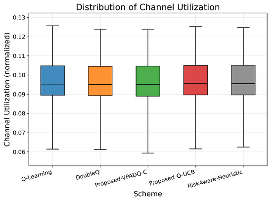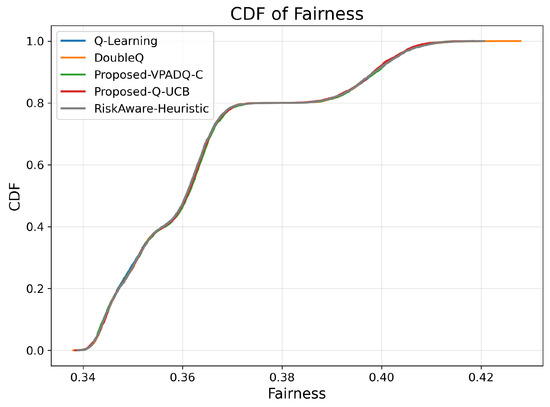 The mean fairness values for all methods were very close to one another, ranging from 0.36410 to 0.36422. Q-Learning achieved 0.36412; DoubleQ, 0.36418; VPADQ-C, 0.36422; Q-UCB, 0.36410; and the Risk-Aware Heuristic, 0.36411. These minuscule variations confirm that the improvements in reliability, delay, and throughput were not made at the expense of fairness among traffic classes. As can be seen in Figure 14, each algorithm followed a uniform fairness distribution, with a median of ≈0.36 and a 90th percentile of ≈0.42. This consistency across methods reflects well-balanced and robust spectrum allocation even under dynamic loads. VPADQ-C and Q-UCB exhibited slightly more compact distributions, indicating more balanced sharing of resources across episodes.