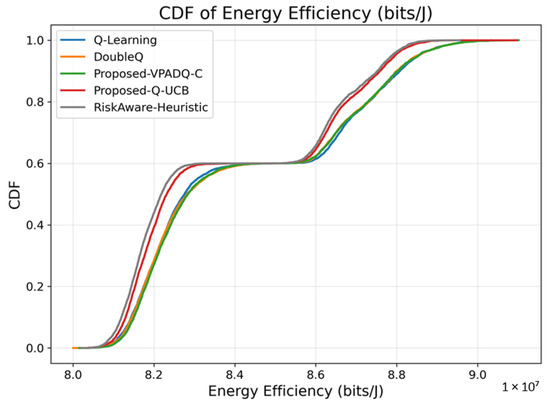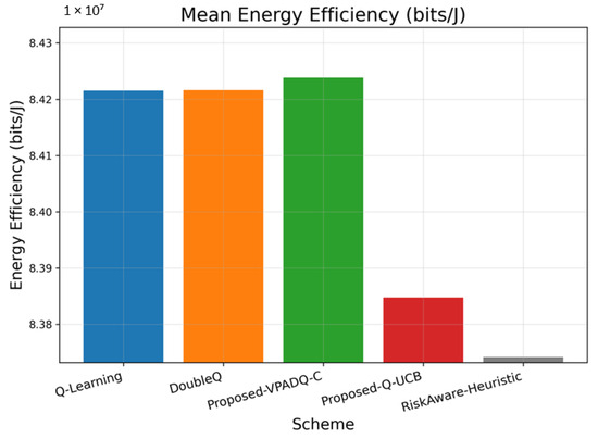 The average performance measures of energy efficiency indicate that VPADQ-C delivered the best performance of approximately bits/J, followed by DoubleQ ( bits/J) and Q-Learning ( bits/J). Q-UCB exhibited a relatively lower value of bits/J, while the Risk-Aware Heuristic performed at bits/J. Although the differences are relatively small in absolute magnitude, a 0.03–0.05% improvement corresponds to substantial power savings for continuous vehicular transmission scenarios.