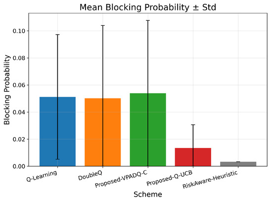Using the aggregated results, the mean blocking probabilities were as follows: Q-Learning, ; DoubleQ, ; VPADQ-C, ; Q-UCB, ; and the Risk-Aware Heuristic, . These values correspond to those in Figure 17 and clearly show a reliability advantage for Q-UCB and the heuristic, while VPADQ-C remains comparable to the baselines under the tested loads.