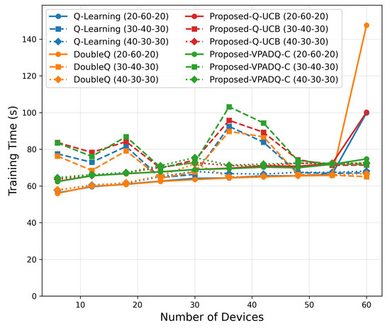 Figure 19 shows that all schemes exhibited sublinear growth in training time with rising network density. At six devices, runtimes were around 55 s, growing to around 90–100 s at sixty devices. Q-UCB and DoubleQ exhibited efficient runtime performance, while VPADQ-C incurred a small added cost (up to 5–10 s) due to CMDP updates. This confirms that all algorithms are computationally efficient for large-scale use.
