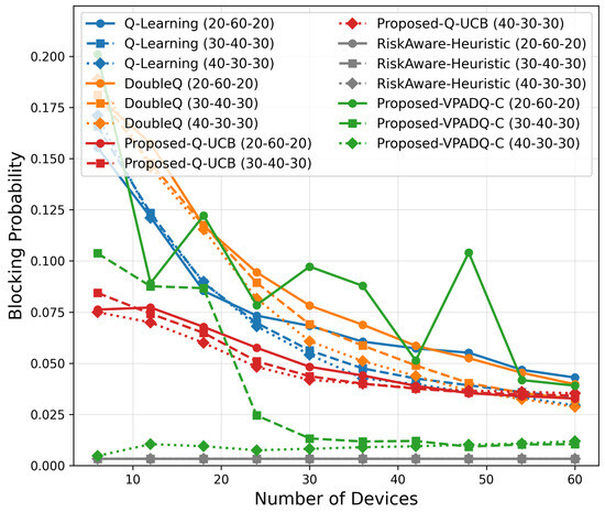 As shown in Figure 20, the blocking probability decreased consistently with the number of devices, indicating improved channel reuse efficiency. At 60 devices, Q-UCB exhibited the lowest blocking probability among all learning algorithms (≈0.028), which was more than 40% lower than Q-Learning (≈0.045). VPADQ-C was slightly higher (≈0.036), but this was more representative of evolving traffic splits. All models remain below , reaffirming reliability even under overloaded conditions.