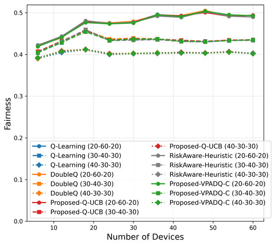 Figure 21 indicates consistent fairness across schemes, which converged to 0.40–0.50 at 60 devices with negligible differences (<0.01). This shows that reliability and throughput gains were achieved without inducing allocation imbalance among heterogeneous traffic classes.