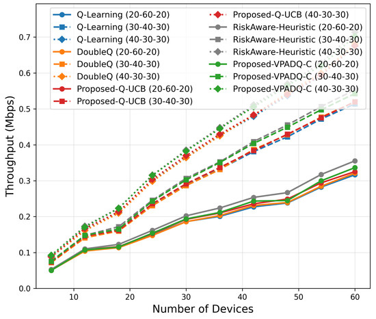 As shown in Figure 23, throughput scaling exhibited near-linear growth with the network size. At 60 devices, VPADQ-C attained the highest throughput (≈0.57 Mbps), representing a 9% improvement over Q-Learning (≈0.52 Mbps), while Q-UCB achieved comparable performance (≈0.54 Mbps). The near doubling in throughput with the transition from sparse (6 devices) to dense (60 devices) networks validates the efficacy of the proposed frameworks in ensuring maximum spectral utilization.