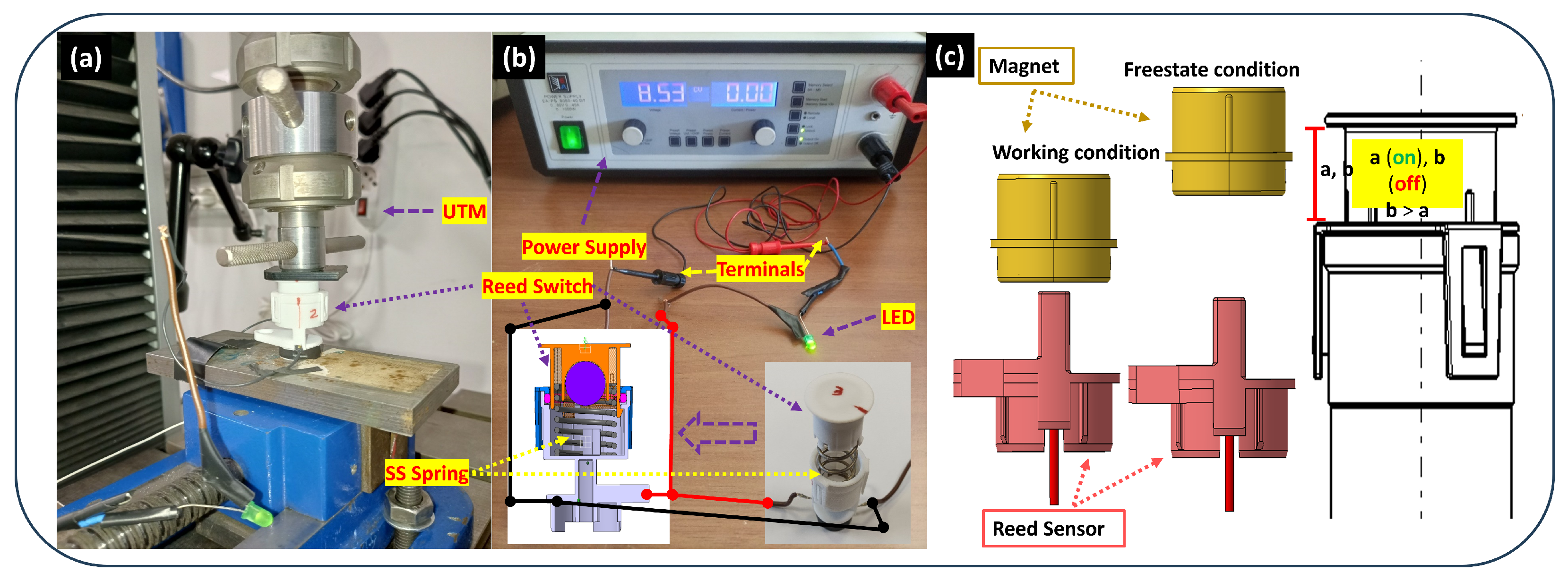 Figure 3. Switching performance of reed sensors with straight terminal spring-integrated prototype testing: (a) precise switching distance measurement using a Universal Testing Machine (UTM), (b) electrical connectivity verification setup showing the power supply and measurement instruments, and (c) schematic diagram of activation and release mechanism of reed sensor.