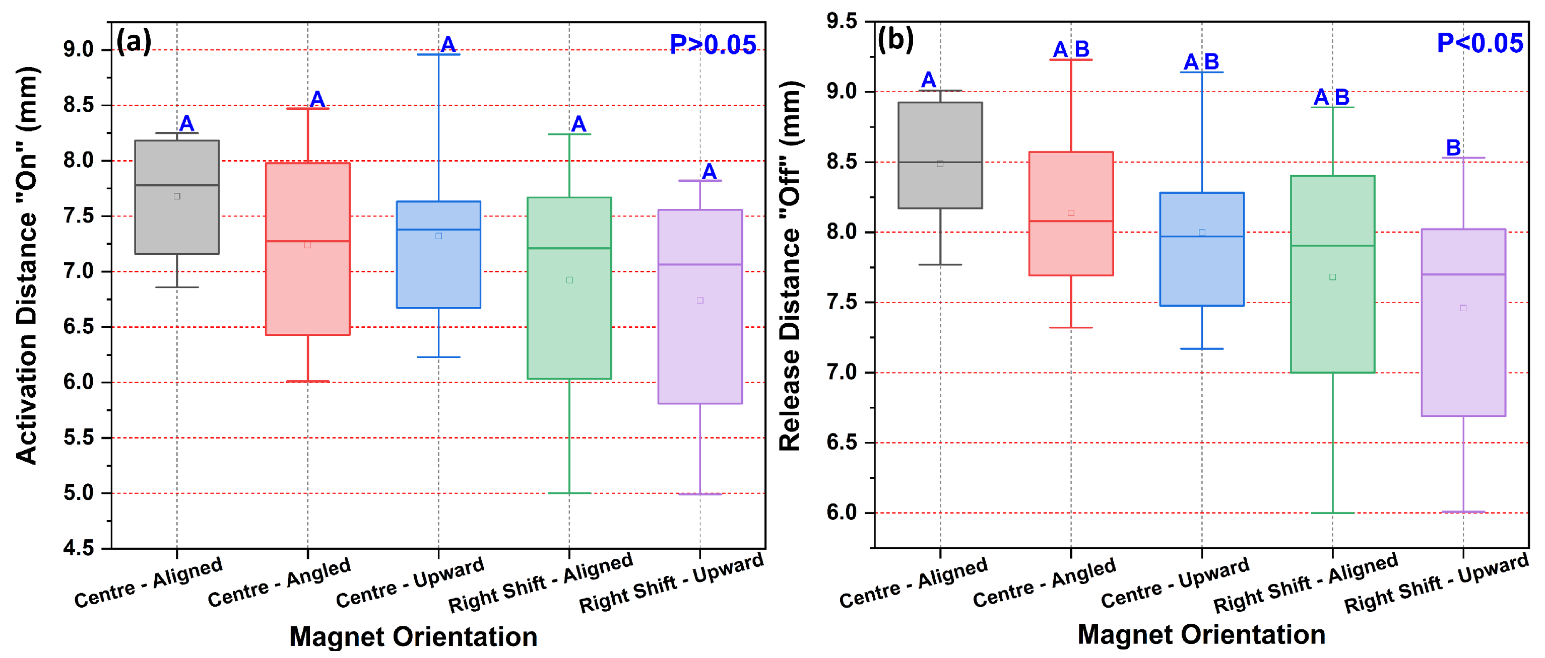 To determine the statistical significance of these trends, a one-way ANOVA with Tukey’s post hoc test was performed. The analysis revealed that the variation in activation (“on”) distances across the five orientations was not statistically significant (F(4,45) = 1.86, p = 0.135). However, a statistically significant effect was found for the release (“off”) distances (F(4,45) = 3.29, p = 0.019). The post hoc analysis assigned the “off” distances to statistical groups “A” and “B”, confirming that the right-shift-upward (Group B) configuration had a significantly shorter release distance than the center-aligned (Group A) orientation.