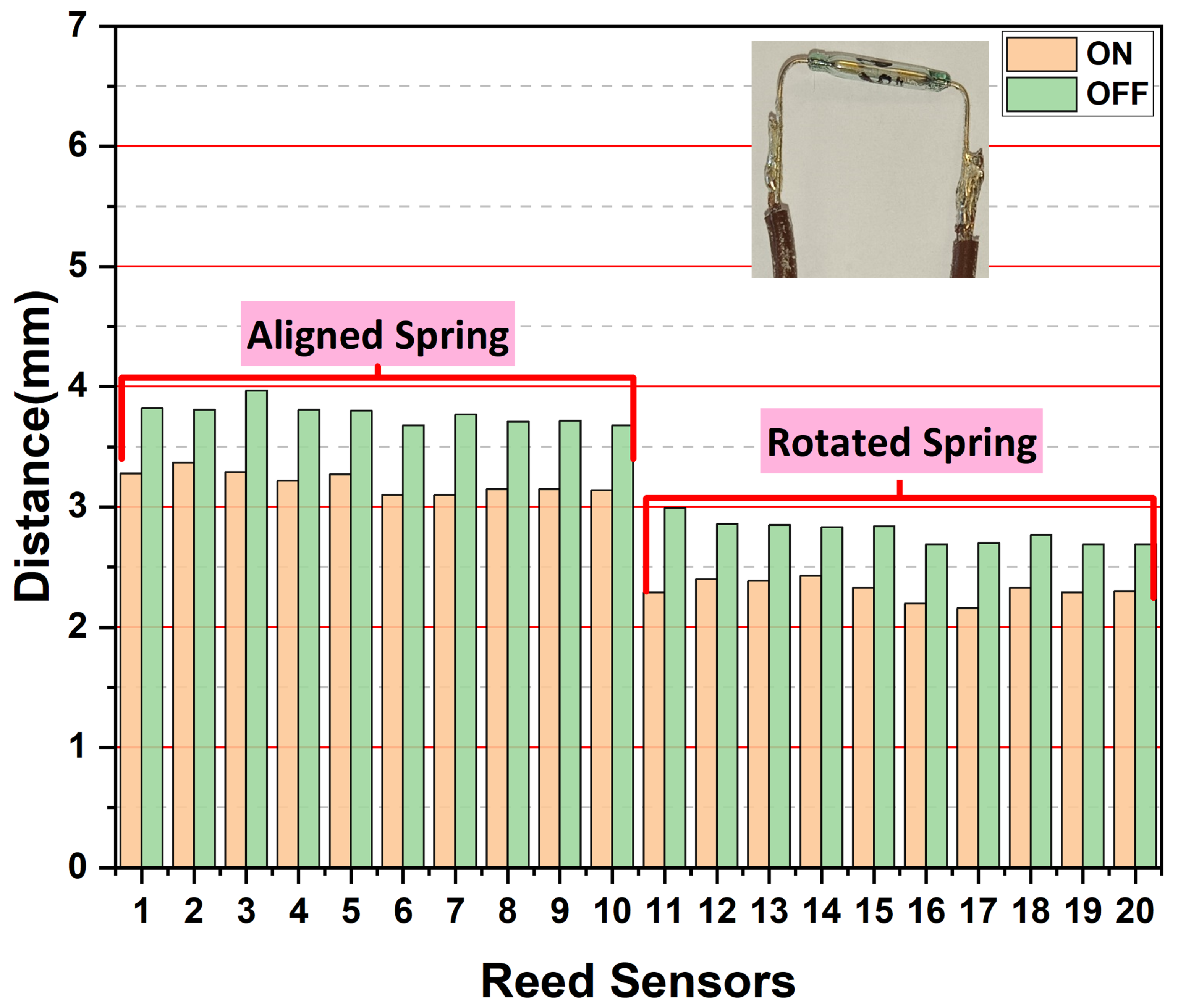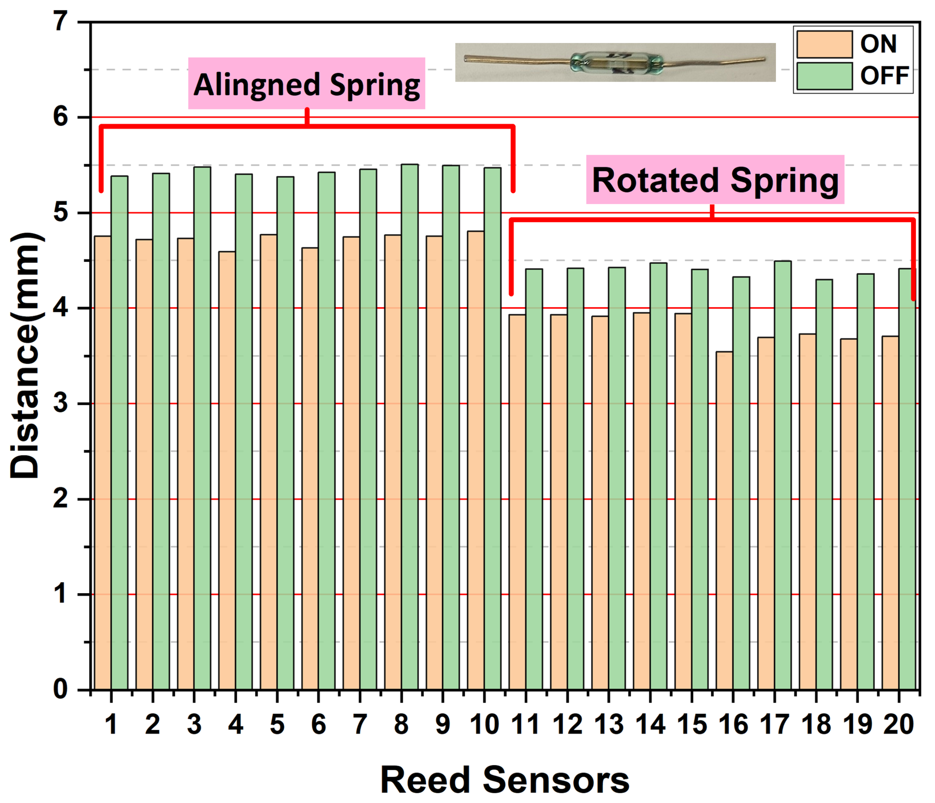 Our experimental findings reveal that both magnetic field orientation and the integration of a spring mechanism substantially influence the switching distances of reed switches, confirming our initial hypotheses regarding performance optimization.