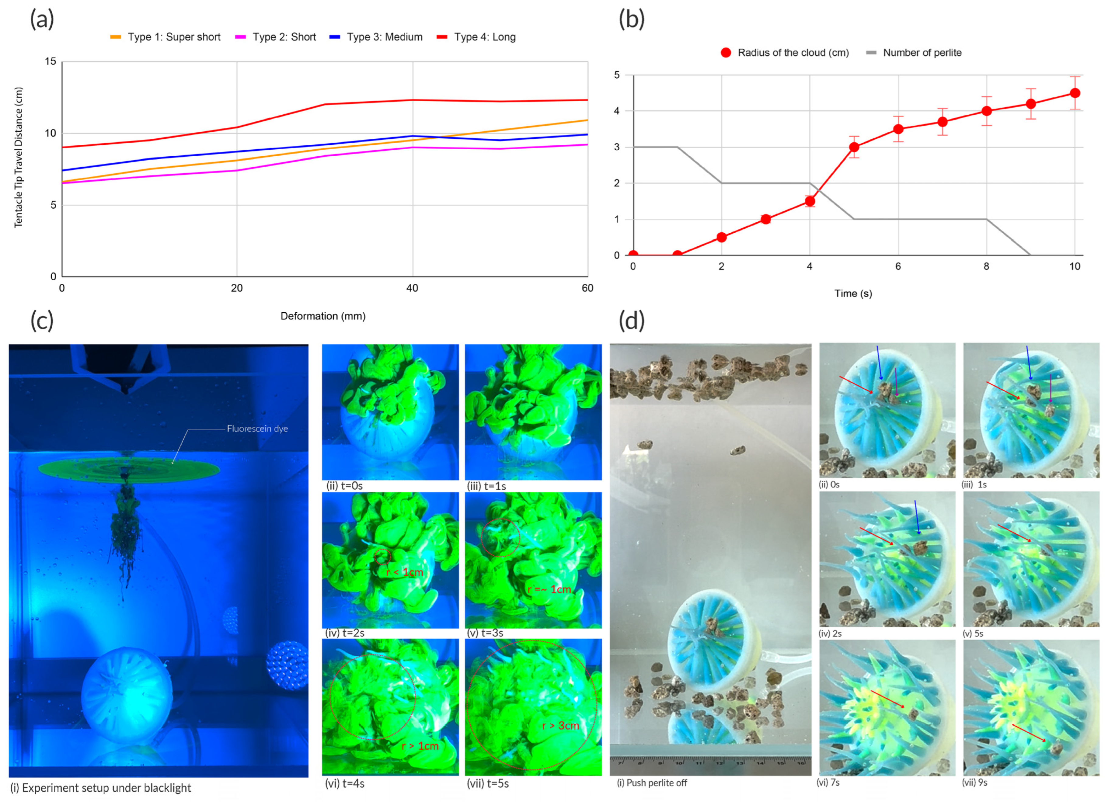 | Soromone (2025) [this paper] | Soft tectonics (three layers of membranes with 60 tentacles) | Silicone | 4 | 4 (see Table 1) | Soromone’s mouth opening/closing mimic sea anemone’s tentacle wiggling behavior and feeding movement | In air and water | ≥4.11 × 104 cycles |