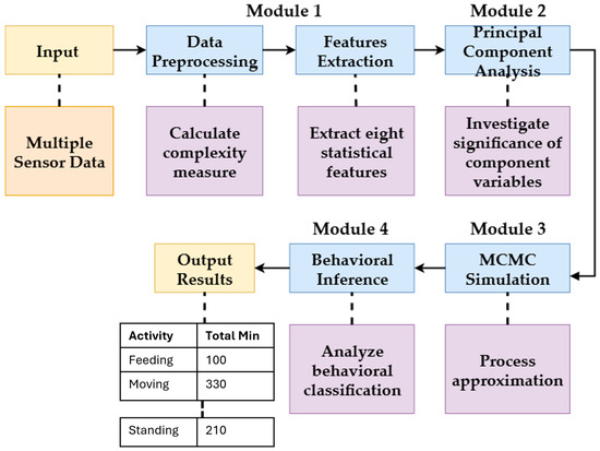In this section, we describe our proposed architecture for analyzing cattle behavior using the Markov Chain Monte Carlo (MCMC) approach with a multiple-sensor data system and a multivariate time series (MTS) with several categories (variables). Our proposed system is a four-module architecture designed for analyzing the MTS data. An overview of the system is illustrated in Figure 3.