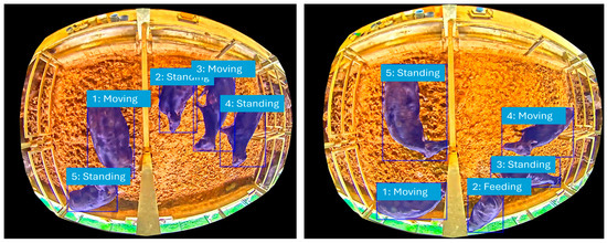 - Feeding (F): Time spent with the head down, detected by the acceleration sensor, combined with proximity to the feeding trough.