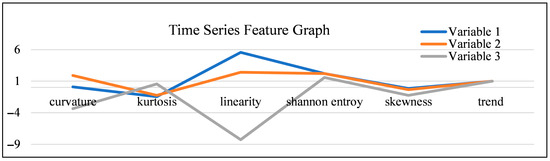 The primary purpose of Figure 5 is to provide a visual aid that supports our variable selection process, complementing the quantitative metrics presented in the omitted Table 1. By graphically illustrating the time series features for these sample variables, Figure 5 visually reinforces the decision to prioritize Variables 1 and 2. For instance, the low and highly negative linearity/curvature of Variable 3 in the figure provides a visual confirmation of its lack of a consistent time series pattern, justifying our decision to consider it a less critical or potentially redundant variable during the dimensionality reduction phase (PCA). This approach ensured that the final MCMC model focused on the most predictable and behaviorally relevant data streams.
