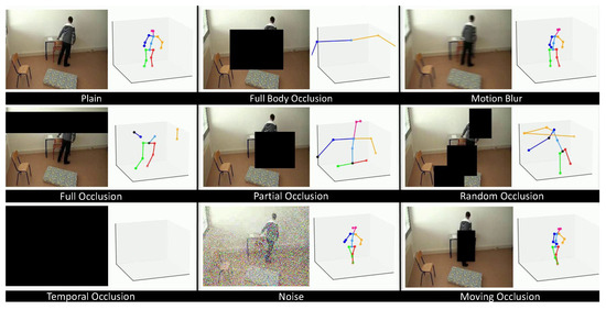 - Occluded Dataset: This dataset was derived from the baseline by applying various types of random occlusions as illustrated in Figure 1. This method simulates realistic scenarios where a subject might be partially obscured before or during a fall. We utilized distinct occlusion modalities, including random black boxes over sequential frames and temporal occlusions, where all frames are rendered black for a short duration. From a single source video, 10 unique occluded variations were generated. The joint predictions were subsequently re-extracted from these altered frames, thereby yielding intentionally degraded coordinate data for robustness training. The resulting corpus was subjected to a fixed, random split for training and testing evaluation.