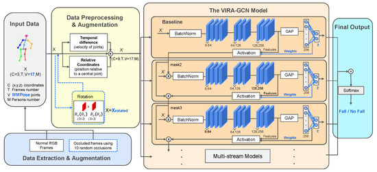This diagram illustrates our proposed VIRA-GCN architecture for Fall Detection. We enhance its robustness to real-world conditions by introducing a novel preprocessing pipeline that augments the 17-joint input data with realistic occlusion and rotations (adapted from the original RA-GCNv2 work by [36]).