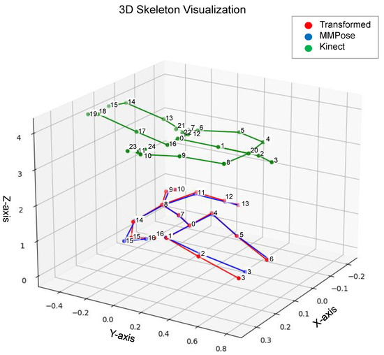 3D skeleton comparison showing the alignment achieved by the per-joint affine transformation. The original Kinect skeleton (green) is transformed to align with the target MMPose skeleton (blue), resulting in the transformed skeleton (red). The numbers displayed next to the joints represent the specific index (ID) of the joint within the respective Kinect (0-24) or MMPose (0-16) skeleton format. The mapping between these indices is detailed in the X-axis labels of Figure 4.
