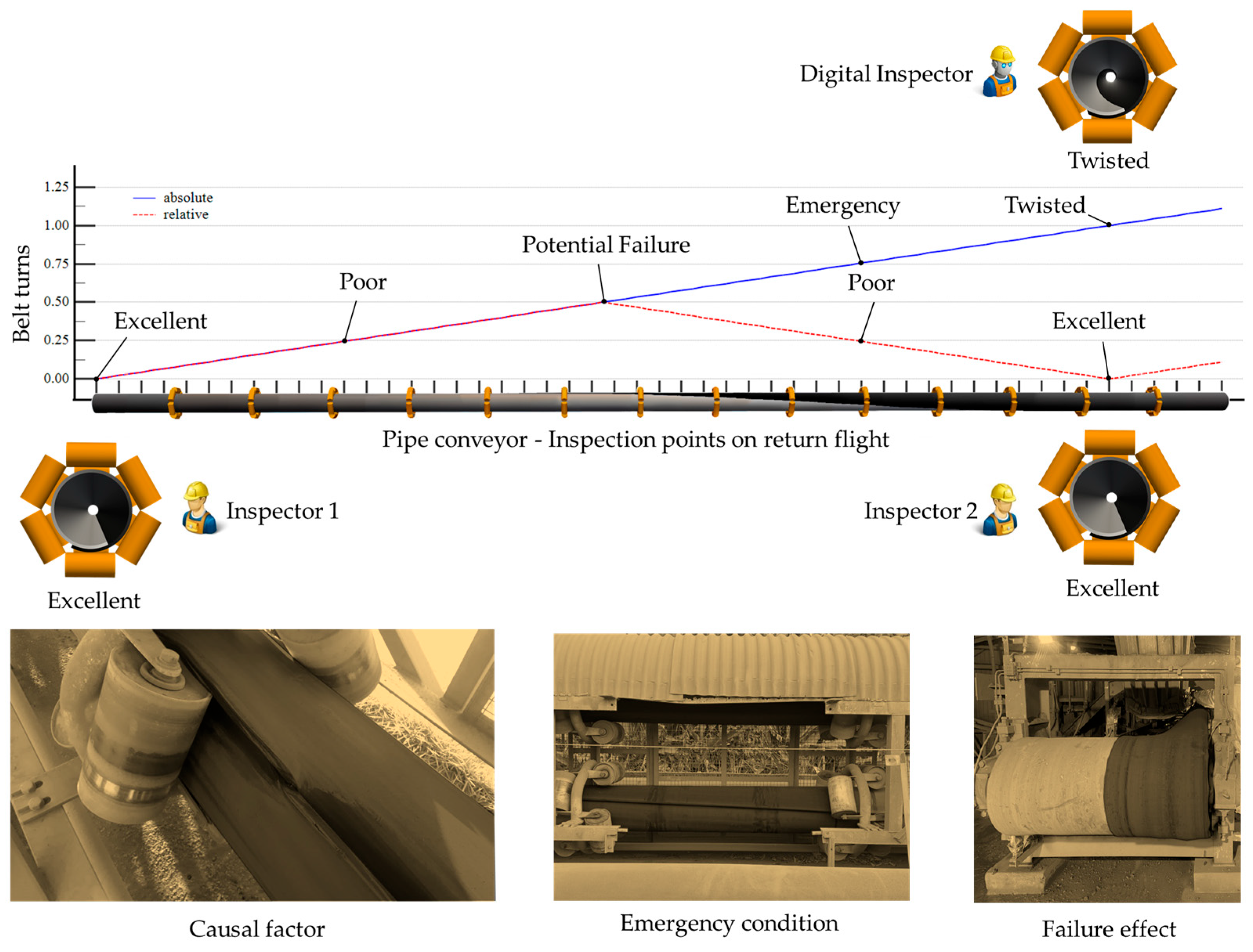 Furthermore, we evaluated the scenario of operational instability, which frequently affects pipe conveyor operations and can lead to twisted belts. Such scenarios can lead to misinterpretations in monitoring systems that rely solely on angle detection, posing a challenge for both human-based and digitized inspections. To exemplify the misinterpretation challenges caused by unstable or twisted belts, which frequently affect pipe conveyor applications, consider a hypothetical scenario involving two maintenance technicians inspecting a twisted belt on the conveyor’s return flight at two distinct points while communicating via radio, as illustrated in