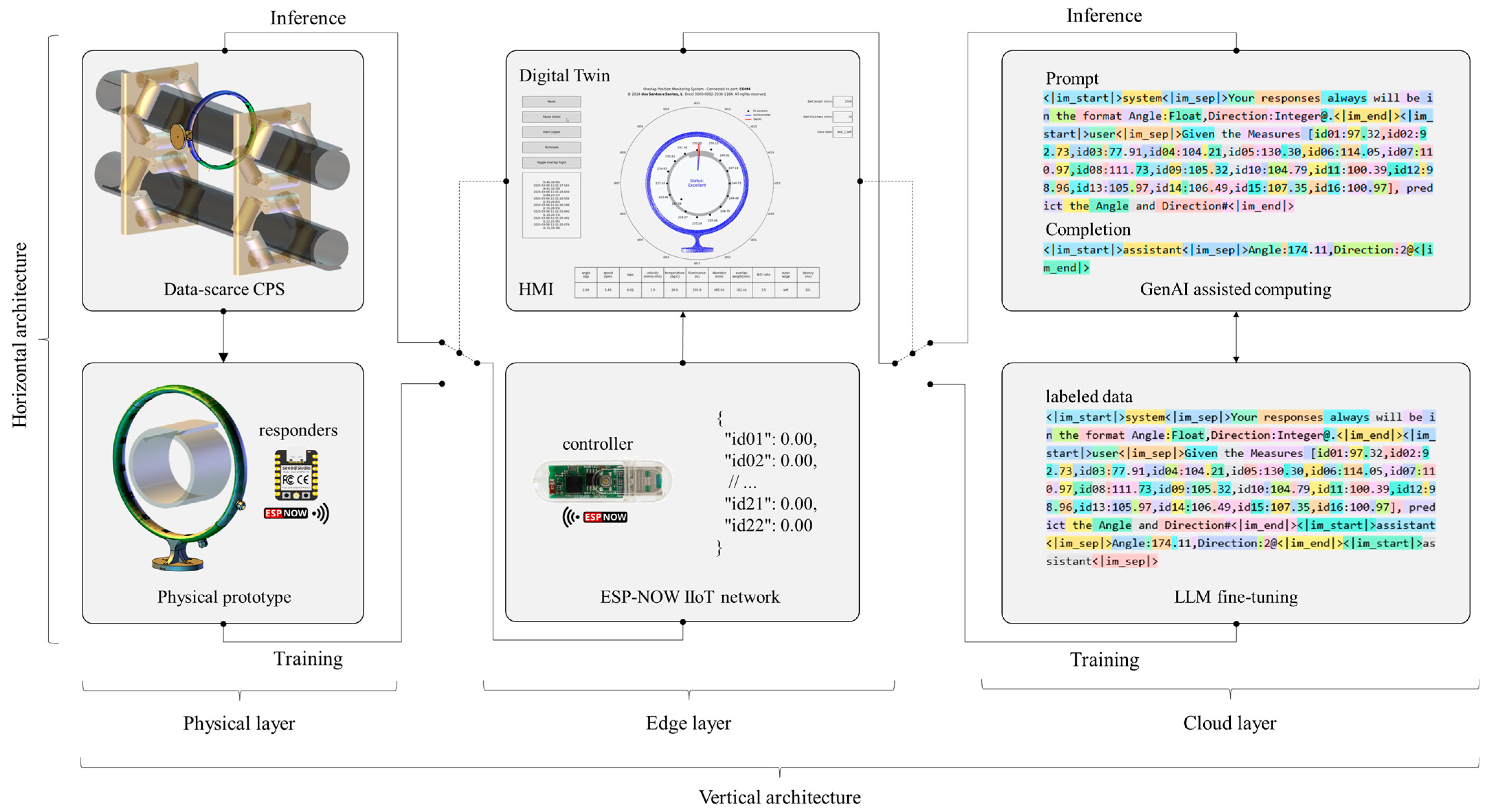 For digitization, the method involved switching to a digital twin and using its HMI to collect labeled data from the physical prototype in the physical layer. The cloud layer was then configured, in the vertical architecture, to fine-tune an LLM using these collected samples. This approach composed the training function in horizontal architecture.