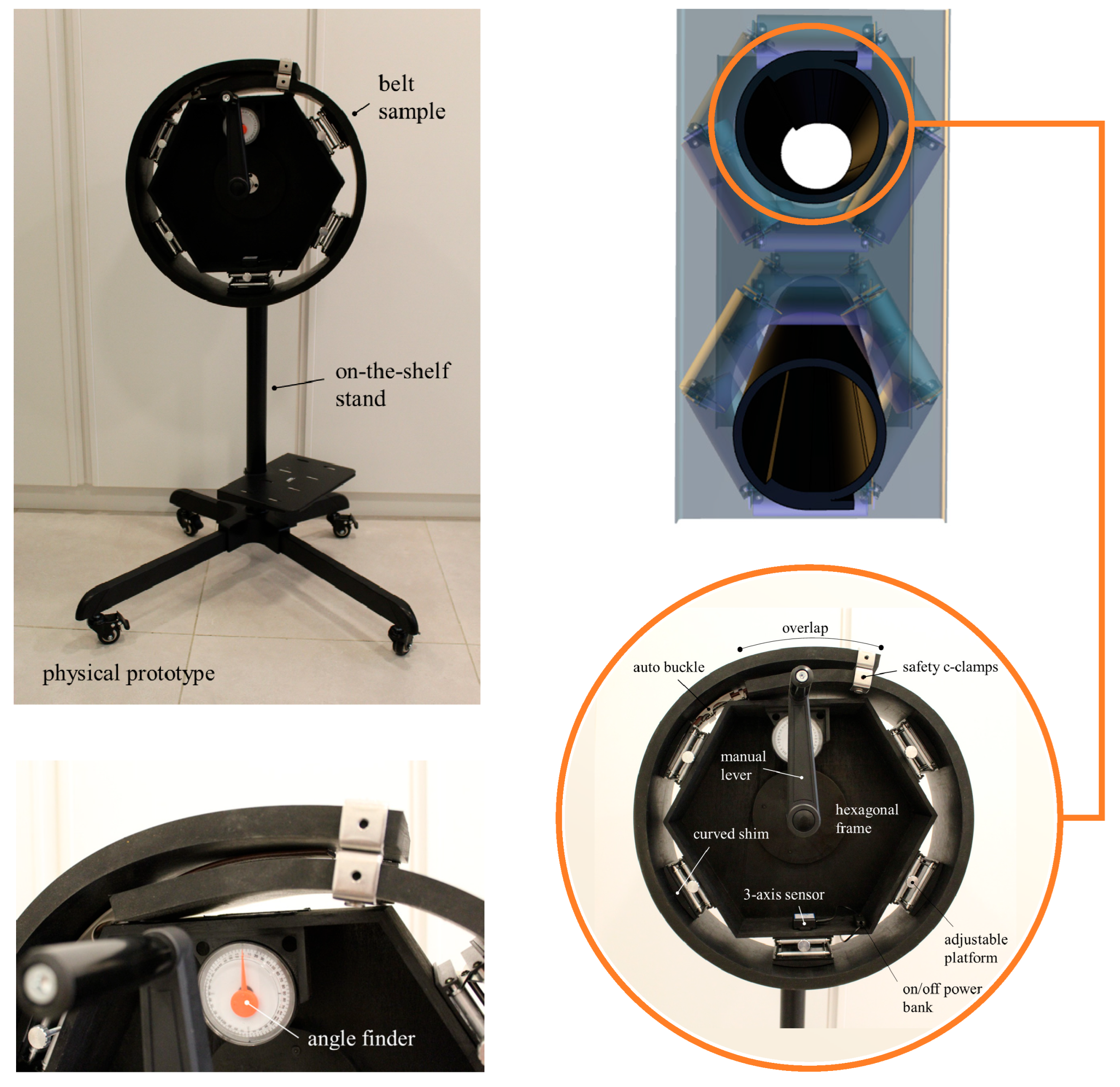 Figure 4 shows the physical prototype of the proposed system. By releasing the auto-buckle and safety C-clamps and adjusting the five lifting platforms, different B/D ratios can be set. The manual lever and stand swivel enabled the reproduction of multiple belt rotation scenarios, providing training data that would be unachievable in a real-world application.