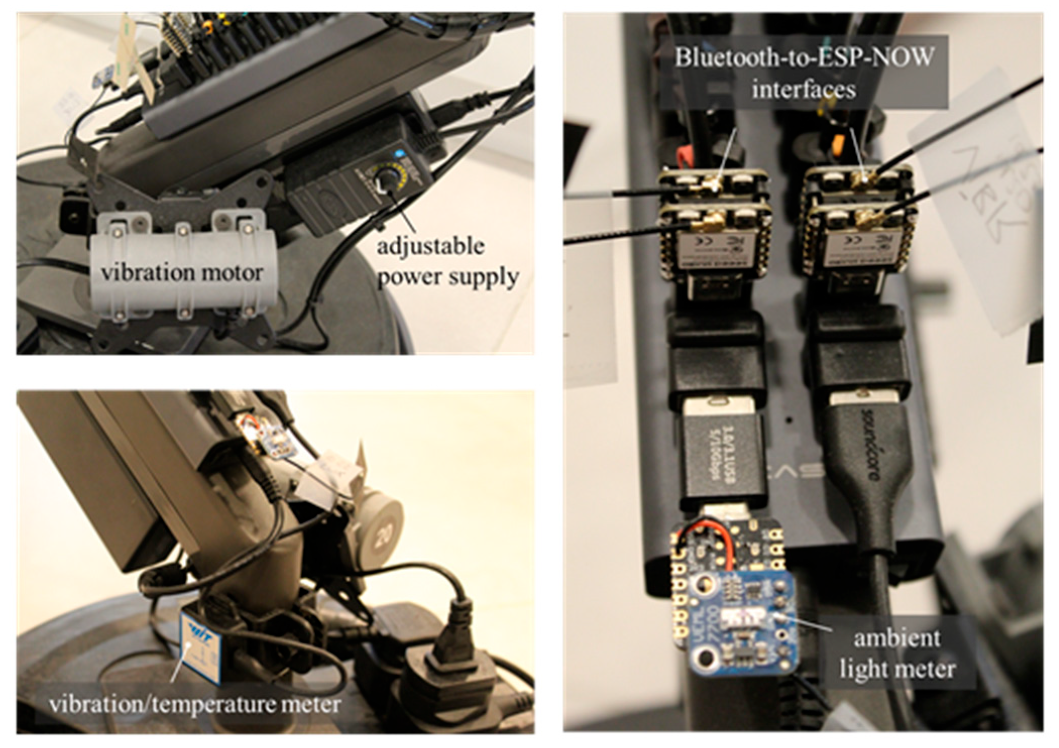Figure 6 shows the variable-speed vibration motor, customized Bluetooth-to-ESP-NOW interfaces, and the ambient light measuring board.
