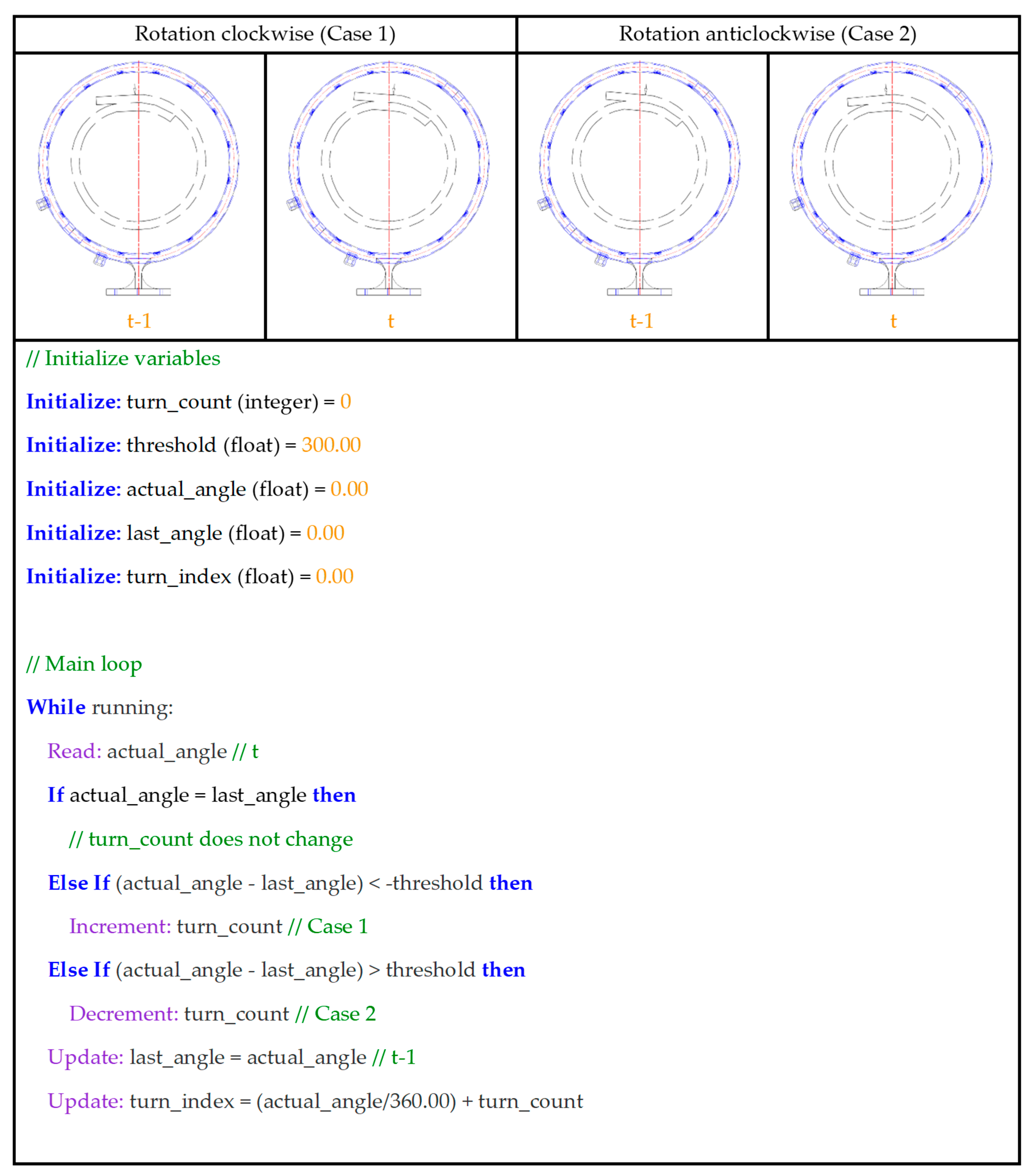 Figure 7 presents a pseudocode of the adopted approach for monitoring the absolute belt turns.