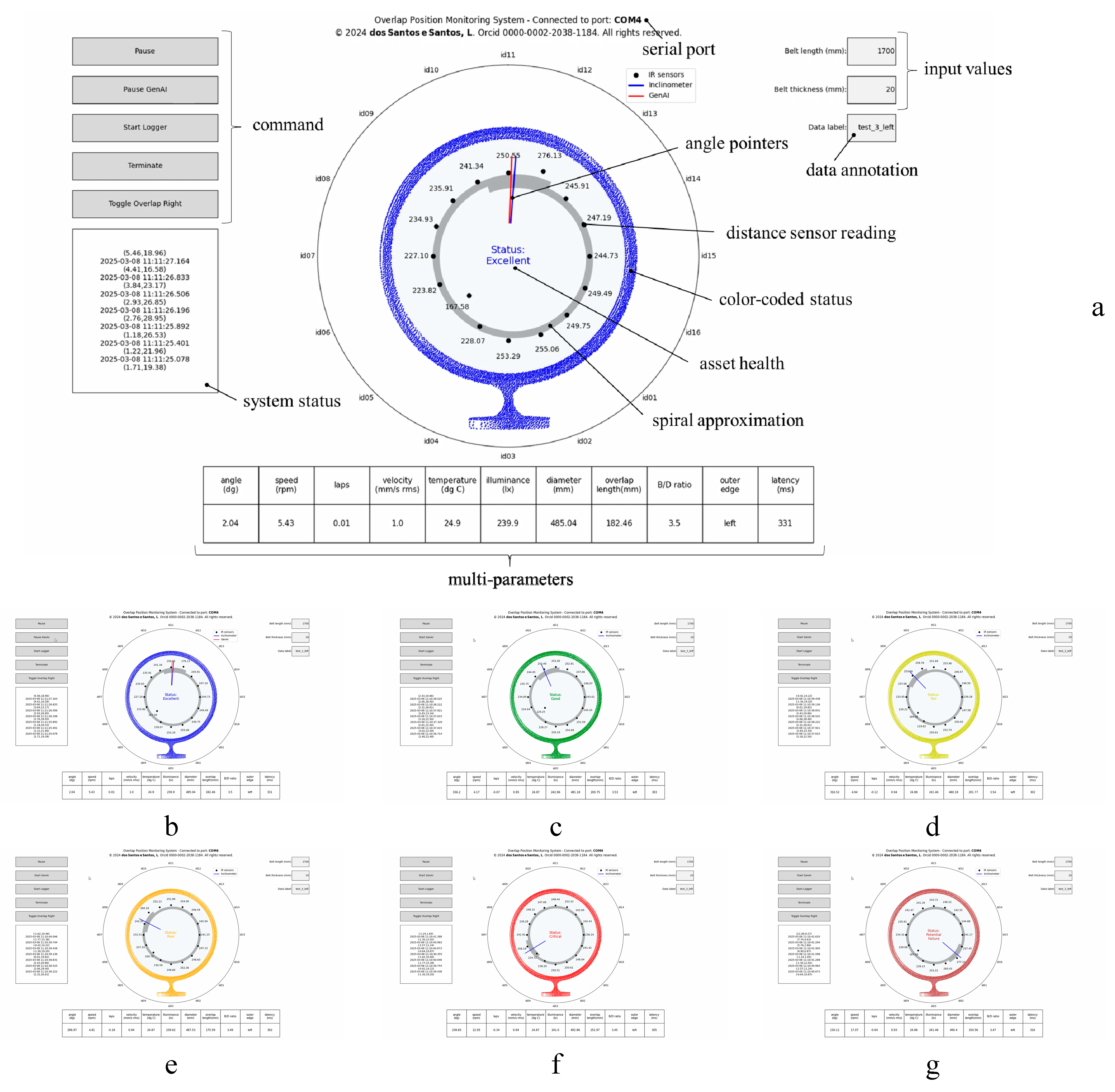 At startup, the program listed the available serial ports and automatically connected to the ESP32 USB dongle, populating its port number in the HMI. We added an asset health status label at the center of the point cloud. Both the image and status labels were color-coded as follows: excellent (blue), good (green), fair (yellow), poor (orange), critical (red), and potential failure (brown).