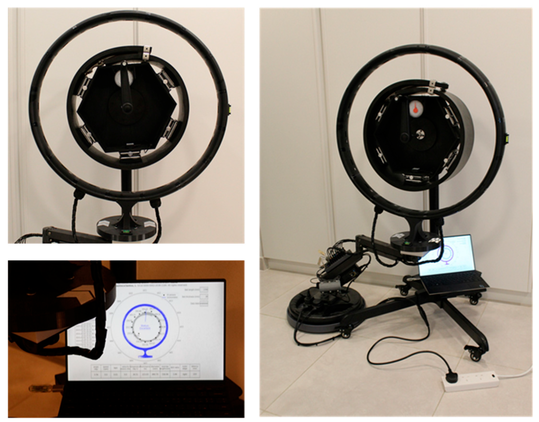 To regulate the B/D ratio belt, we attached lifting platforms to five of the six outer faces of the hexagonal frame, each with a 90 mm × 90 mm surface area and height adjustable from 30 to 90 mm. We printed and attached curved shims in PLA with a radius of 180 mm and a maximum height of 10 mm to the lifters’ surfaces to smooth the belt conformation into a tubular shape. We also attached a 360° analog angle finder for visual reference at the 12 o’clock position. To collect 3-axis motion measurements, a Bluetooth sensor module, WT901BLECL (WitMotion, Shenzhen, China), was attached at the 6 o’clock position. This battery-powered module features a 250 mAh battery capacity with a Type-C charging connection, an inclinometer accuracy of 0.05° on both the x and y axes, and a 16-bit gyroscope resolution with a stability of 0.05°/s. A 5000 mAh power bank was attached to the wooden frame and connected to the module using a 300 mm on/off Type-C extension cable.
