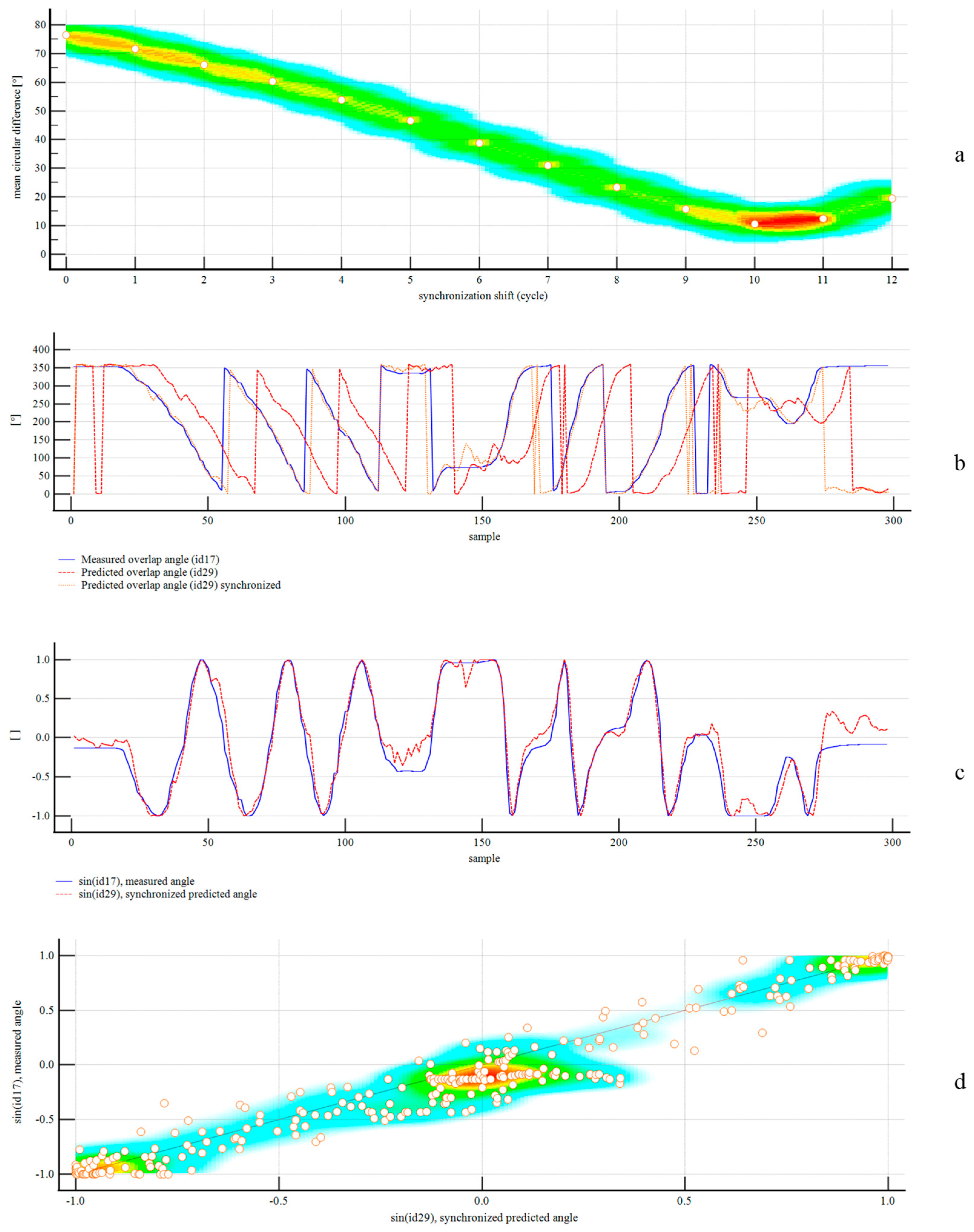 33], who considered a 180° belt rotation at 10 RPM as the potential failure threshold owing to belt rotation. Therefore, we calculated the relative number of turns as a 2-digit float resulting from the measured or predicted angle divided by 360°, assuming the target position as the top overlap position (0°). To compute the absolute number, we adopted incremental and decremental values for clockwise and anticlockwise rotations, respectively, in relation to the belt’s running direction. We implemented an algorithm to detect when the readings crossed the boundary between 0° and 359.99°. When the variation between consecutive cycles was less than −300° (e.g., from 357° to 2°, resulting in −355°), the rotation was deemed clockwise, and we incremented the turn counter by 1 unit; conversely, when the variation exceeded +300° (e.g., from 1° to 359°, resulting in +358°), the rotation was deemed anticlockwise, requiring decrementing the turn counter by 1 unit.
