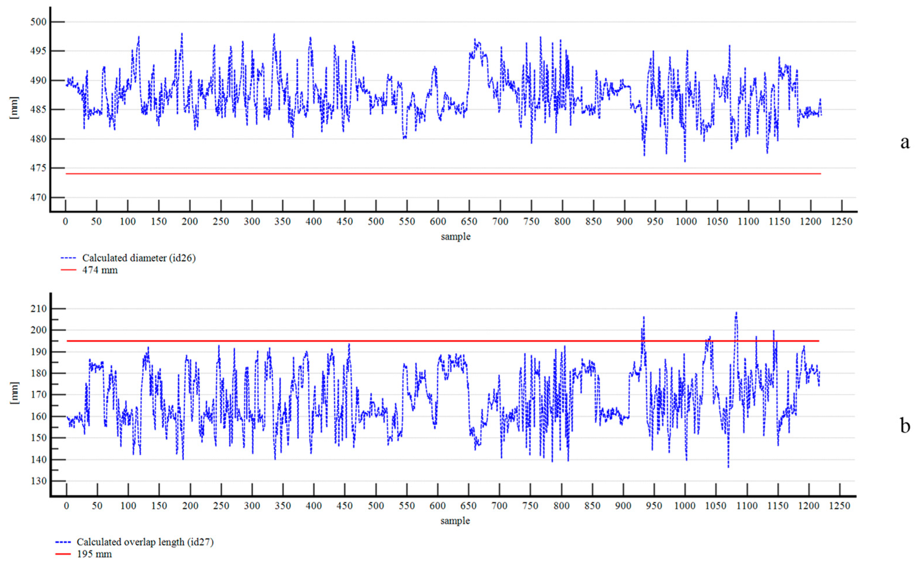 60] and can be a good predictor of troughability when compared to the designed or usual operational values. This was achieved by processing 16 distance measures to calculate the pipe diameter. First, we converted the radial distances of the sensor into Cartesian coordinates, considering the device’s radius. Next, we applied least-squares optimization to estimate the center of the belt sample. We then determined the distances between pairs of opposite sensors (e.g., at 0° and 180° or 45° and 225°). Subsequently, we ranked the eight paired values and filtered potential outliers by dismissing the first and last three values. Finally, we applied a 20-sample moving average to ensure measurement stability.
