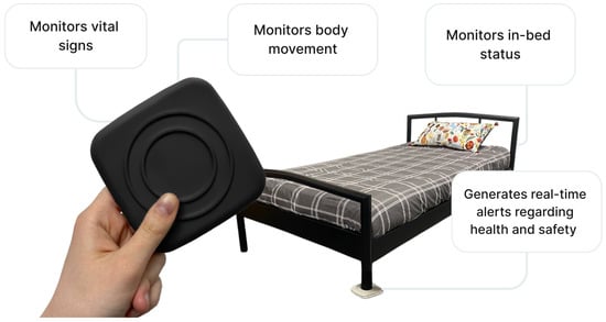 Technologies to monitor sleep, including sensor-based monitoring systems, have been identified as valuable tools for enhancing resident safety, reducing falls, and promoting better sleep through continuous, non-invasive monitoring [,]. Non-wearable sensors have been shown to be effective from a clinical practice perspective as they can detect activity patterns and determine what is normal and abnormal over time []. Research has extensively studied sleep quality and sleep disorders (e.g., sleep apnea) using sensor devices []. Research has shown that bed sensors can be used to capture multiple measurements, including regular and irregular sleep patterns and frequency of bed exits, which can inform the health and well-being of LTCF residents, in particular for residents with dementia []. Schütz et al. found that monitoring of body movements in bed by contactless bed sensor devices over time can allow for proactive screening and monitoring of health and can serve as an easy to acquire digital biomarker []. One example is Toch Sleepsense, a sensor system designed for placement under residents’ beds, which integrates with existing nurse call and smart care systems []. This technology, shown in Figure 1, enables staff to conduct virtual bed checks by providing information about residents’ vital signs and whether residents are in or out of bed, potentially reducing nighttime disruptions for residents and decreasing caregiver workload. By facilitating remote monitoring and generating real-time alerts, it has the potential to contribute to improved resident safety, sleep quality, and overall care management.