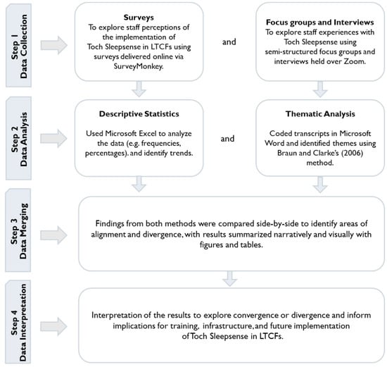 This research employed a convergent mixed-methods design to evaluate the implementation and perceived impact of Toch Sleepsense in three LTCFs in Western Canada. This approach was chosen to concurrently collect qualitative and quantitative data, allowing for data triangulation to promote a nuanced understanding of the complex implementation processes of the technology in LTCF settings.